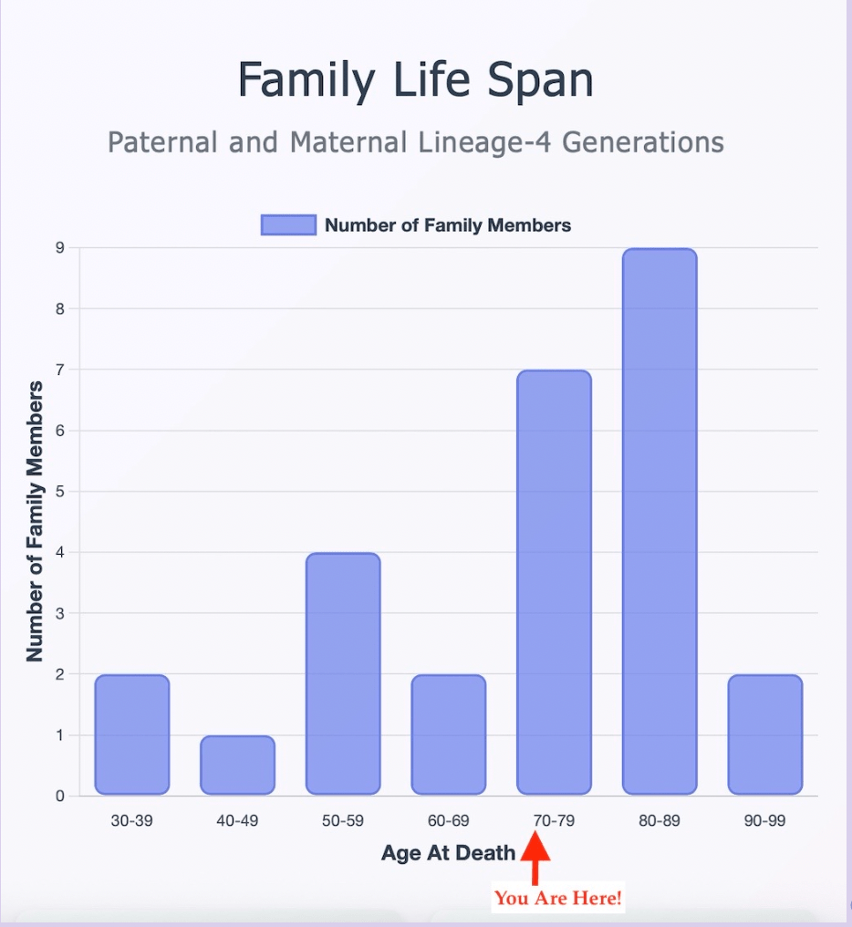 FamilySearch, a website managed by The Church of Jesus Christ of Latter-day Saints, apparently has the largest genealogical database in the world. Upon reviewing it, I was amazed to discover that one branch of my family tree dates back to the 1500s. Hoping to extend my actuarial odds of about twelve remaining years, I decided to tabulate family life spans going back four generations in all directions. The analysis proceeded smoothly until I inserted the red arrow.