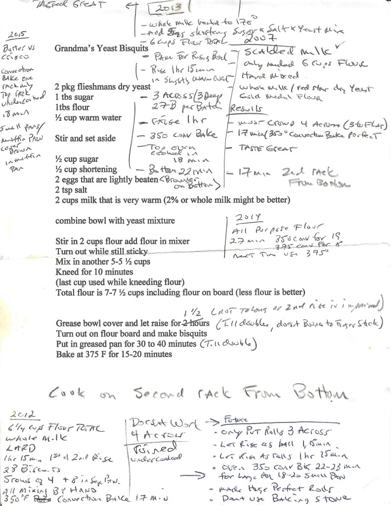 The notes along the perimeter of the recipe document procedural adjustments I’ve experimented with over the years. Every year at Thanksgiving, I call my sister and ask how her rolls turned out. Her answer is usually “Really good!”